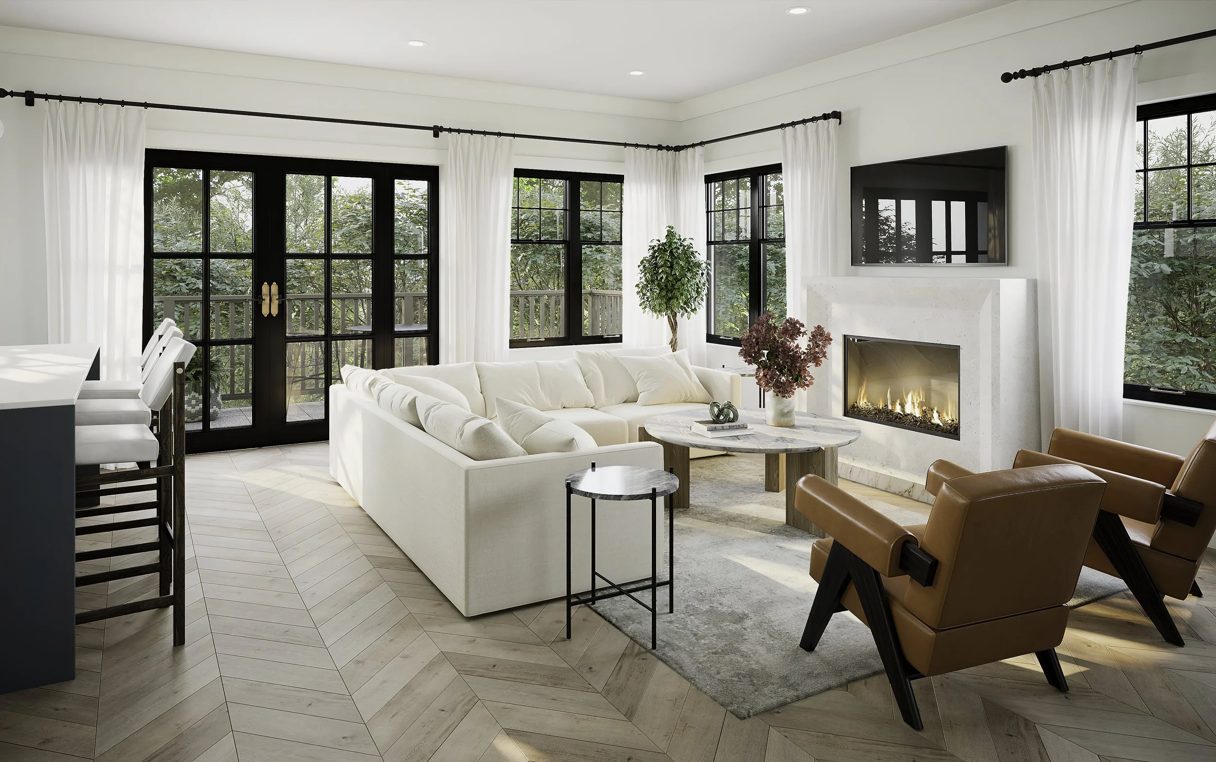 Elements such as soft curves, hand-crafted wall tiles, and chevron hardwood floors speak to the unique identity of the structure and location. Matte painted shaker cabinets, textural countertops, natural marble slab details and cast concrete fireplaces warm the spaces and invite relaxation.